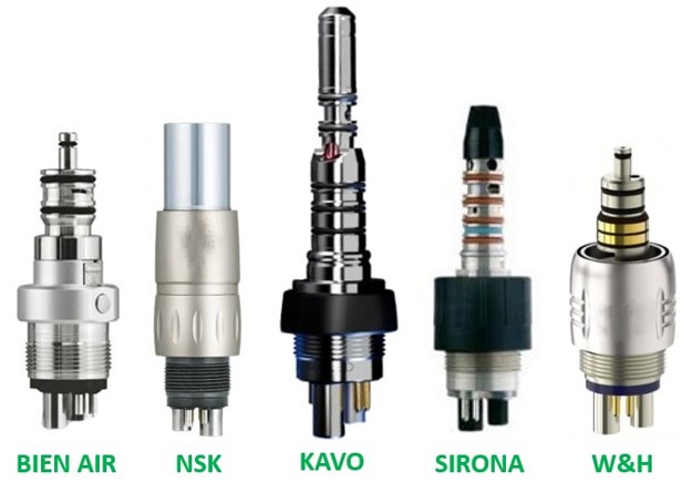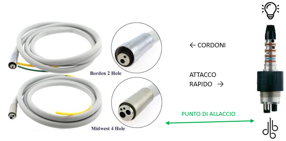 Già menzionati in precedenza, il loro scopo è quello di facilitare la connessione delle turbine dentali al cordone. Ogni importante brand nel settore ha un proprio specifico attacco ma fornisce anche attacchi compatibili con i modelli della concorrenza.