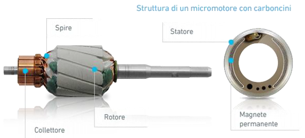 - i brush sono motori a corrente continua in cui il movimento rotatorio è generato dall’interazione dello statore (costituito da due magneti) con il rotore (costituito dalle spazzole di carbone e dagli avvolgimenti).